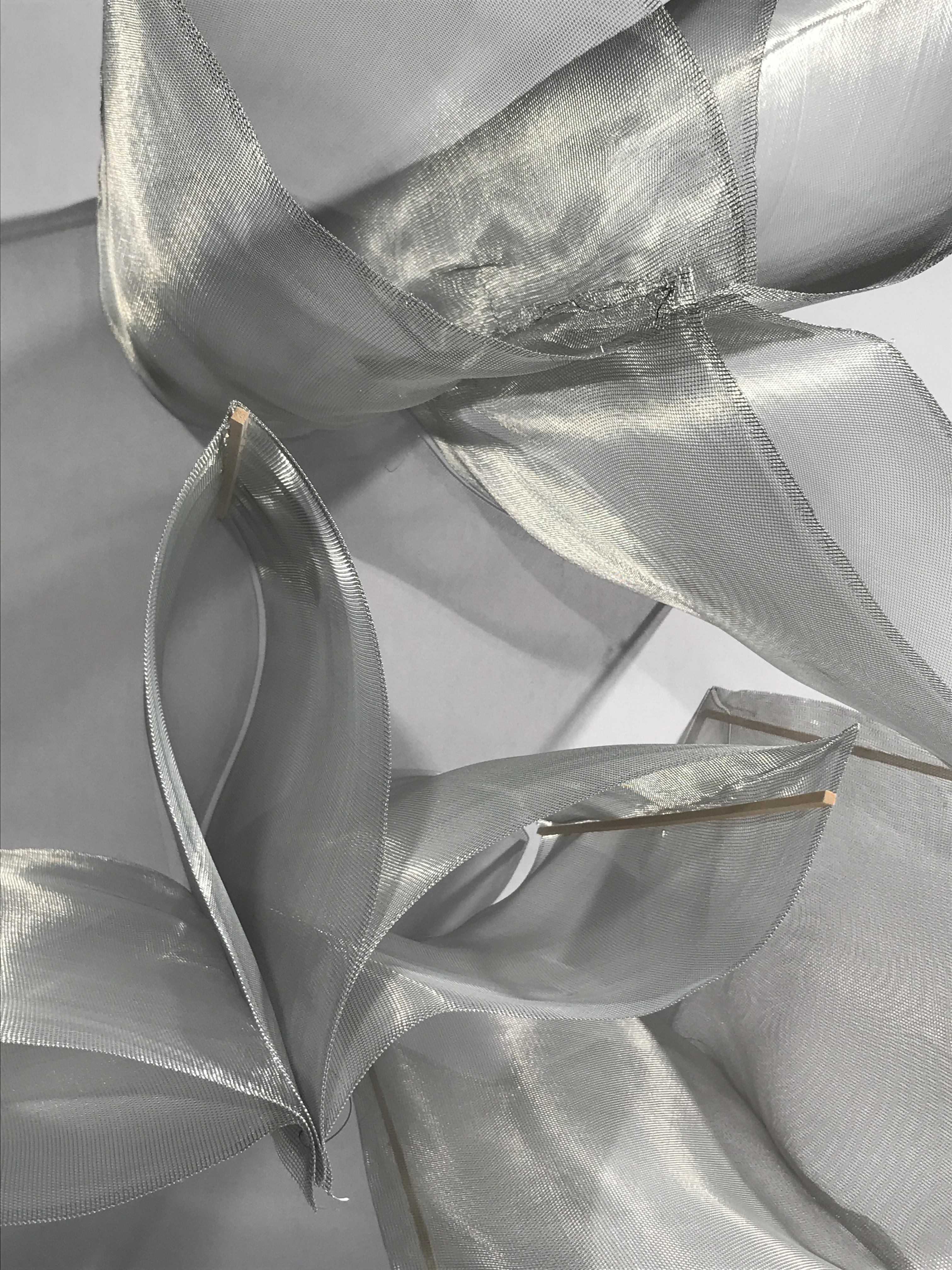 With the corrugated mesh , we aimed at creating a chamber to reflect sound. The sound reflects into the chamber through the cylindrical shapes where it bounces around. With each bounce, the sound diminishes eventually fading away. As for the net structures, they began as an experiment of creating a flexible model using rope. Rope as a material is malleable with potential to be used in infinite ways. The joinery technique of the rope holds the net structure together yet maintains flexibility to shape the net in any way. The addition of panels in the openings provides additional support for the structure to be more sturdy. The weight of the structure then transfers through the rope onto the panels creating a multitude of configurations.